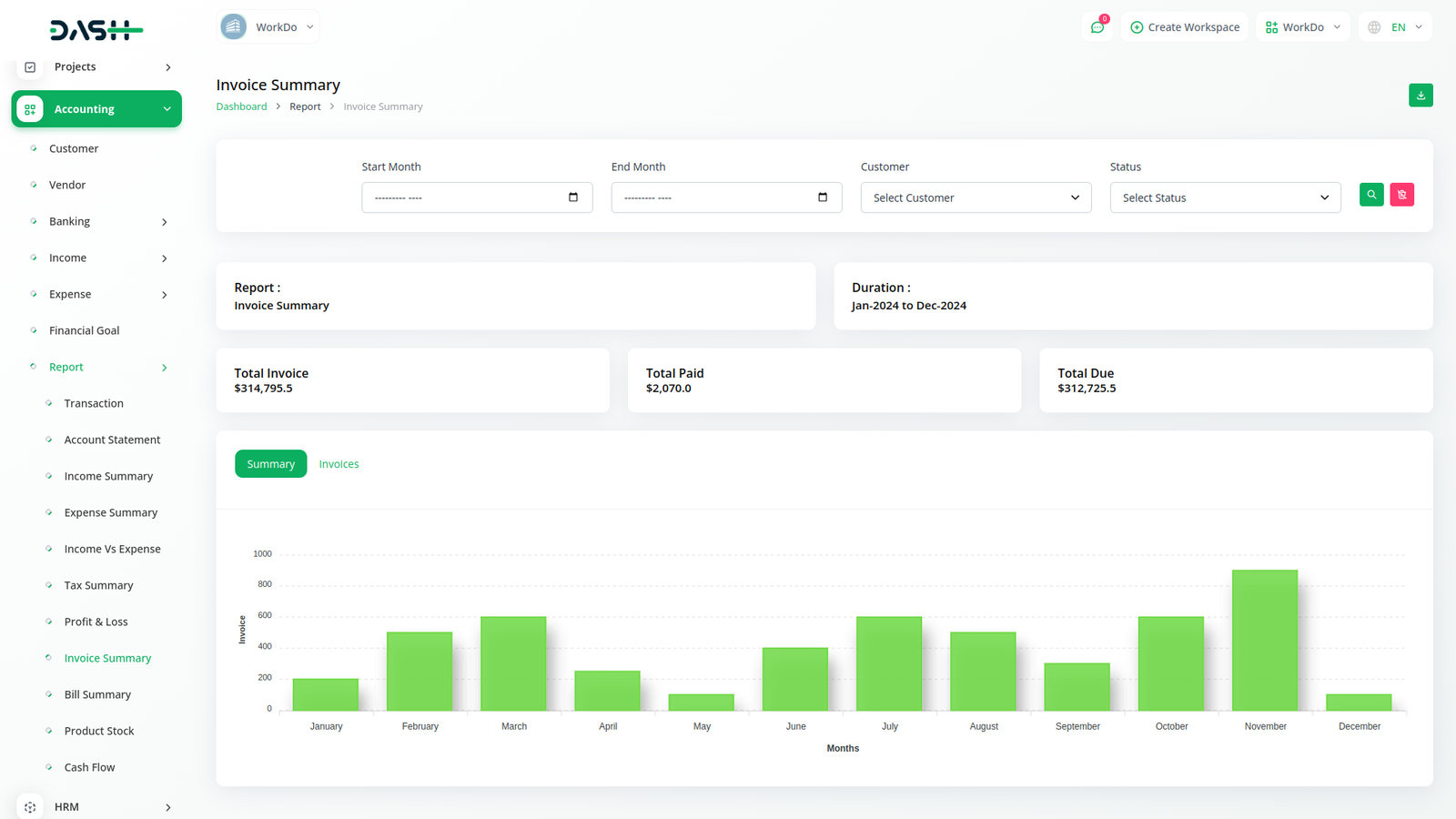 Get a report on transactions with an easy filtering option. Download the required account statements in either PDF, CSV, or Excel format. You get duly prepared reports on individual Income, Expenses, Tax, Invoice, and bill summary. Filter them based on Account, category, and customers. Also, a graphical display of the Income VS Expense chart along with a detailed calculation of Profit and Loss will help you make informed decisions. Filter the tax summary and Income VS Expense chart based on financial years.